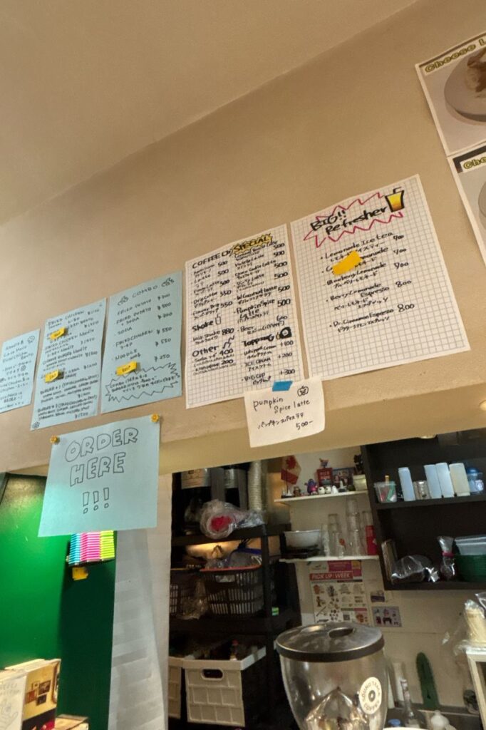 少し進むと段差があり、その手前右側の壁にメニューが貼られています。そこで注文し、お会計は退店時にする形となります。