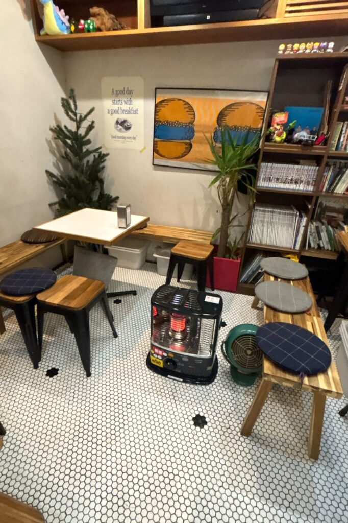 店内はキッチンと平行に奥行きのある形となっており、カウンター席2席と2名掛けのテーブルが2席、奥にコの字型の大きめのテーブルと横並びのベンチ席(テーブルあり)があります。